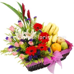 Basket arrangement of Fresh flowers and Fruits.