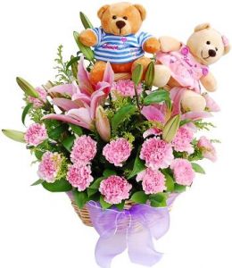 Pink Lilly and carnition with teddy beautifully arrananged bouquet